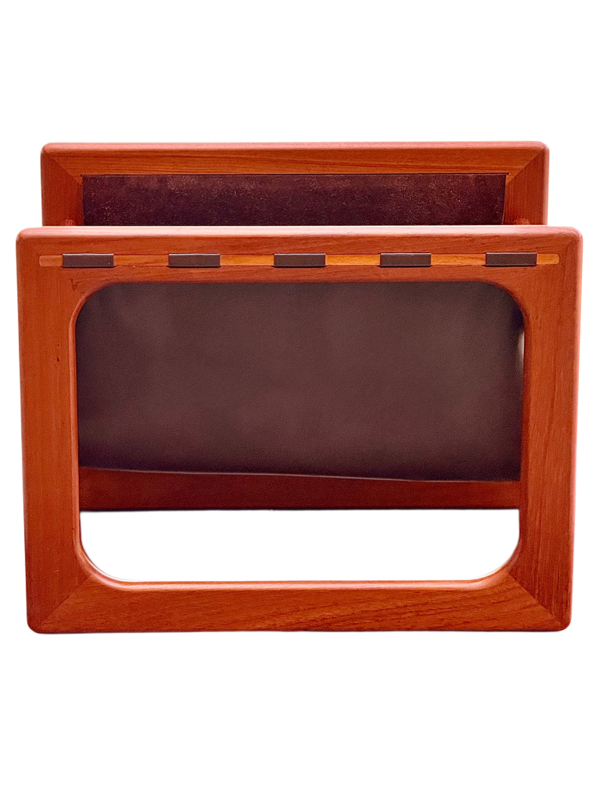 Danish Modern magazine rack, designed by Aksel Kjersgaard for Salin Møbler, in a rich, oiled teak and supple brown leather. The piece features a beautifully balanced twin-compartment structure—perfect for organizing magazines, vinyl records, or stylish home essentials.