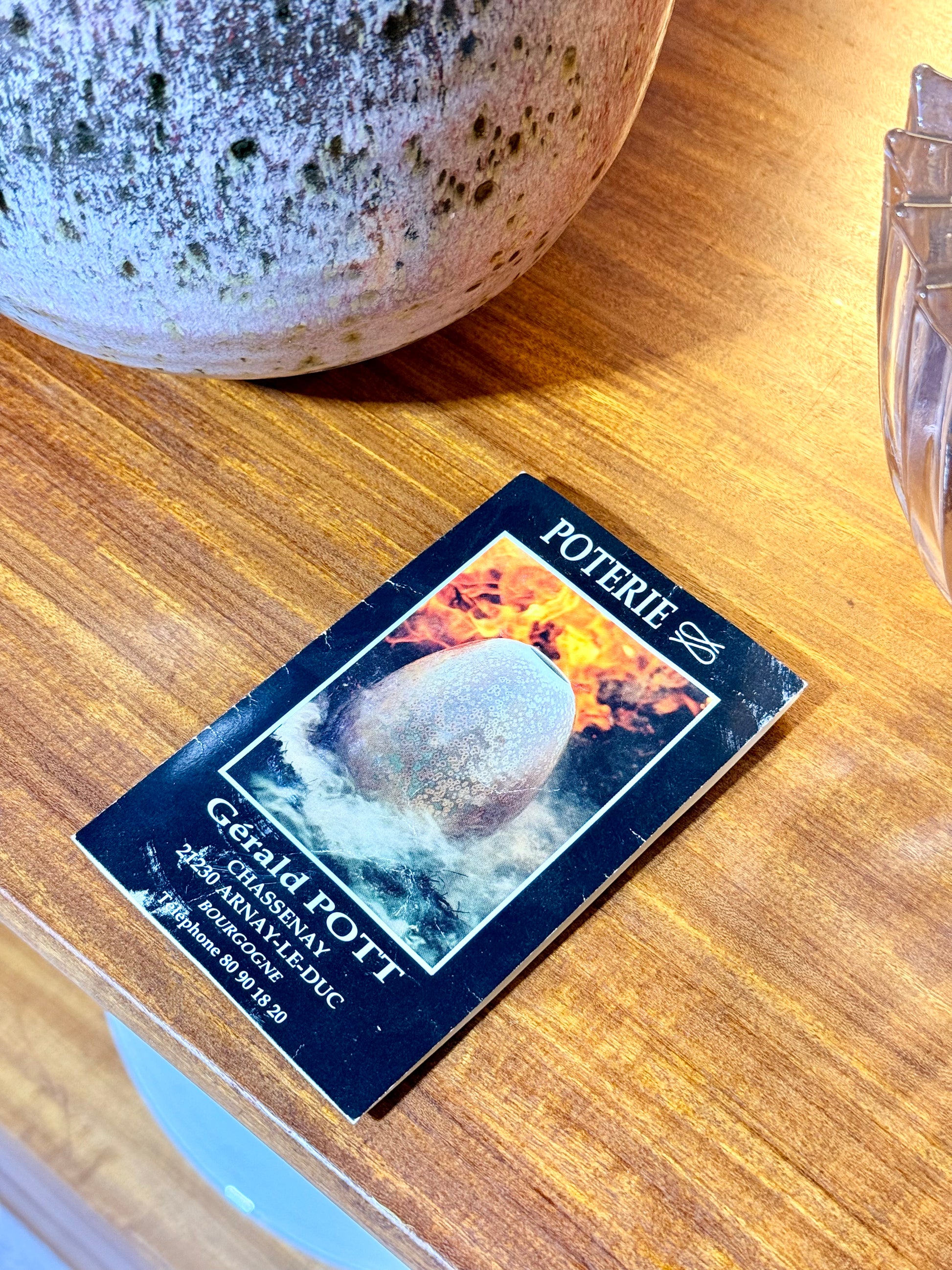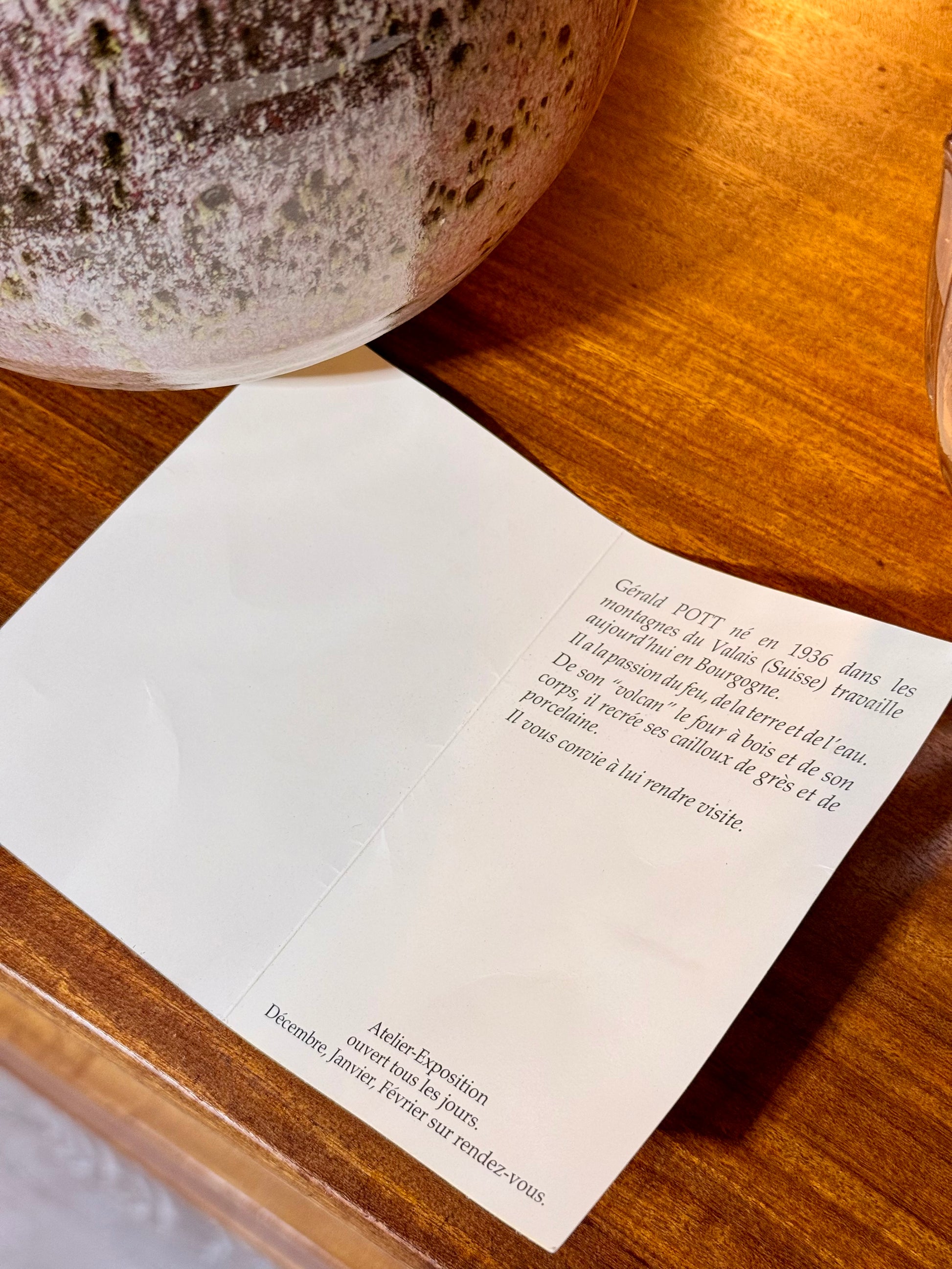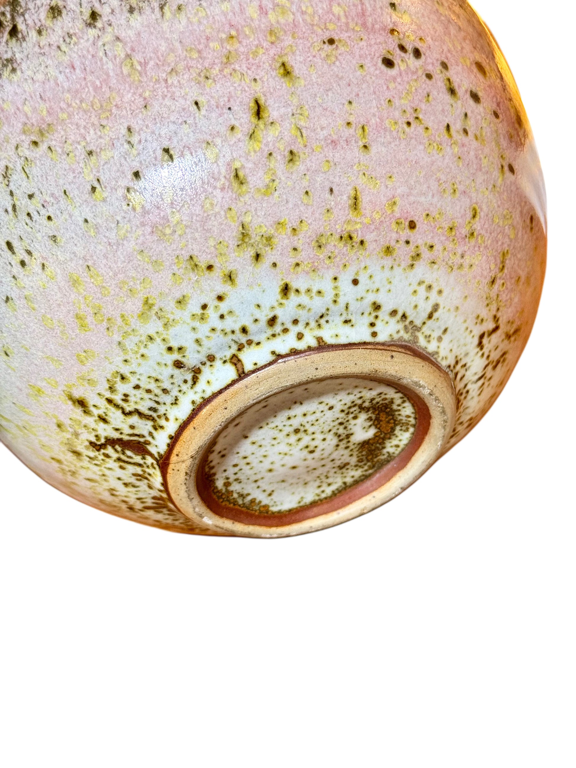 Hand-thrown stoneware vase by renowned French potter Gérald Pott (1936–2021), wood-fired in his Burgundy studio. Bulbous body with narrow neck; complex reduction glaze in pink, crimson, amber, olive and brown with ash speckling and runs. One-of-a-kind studio pottery.