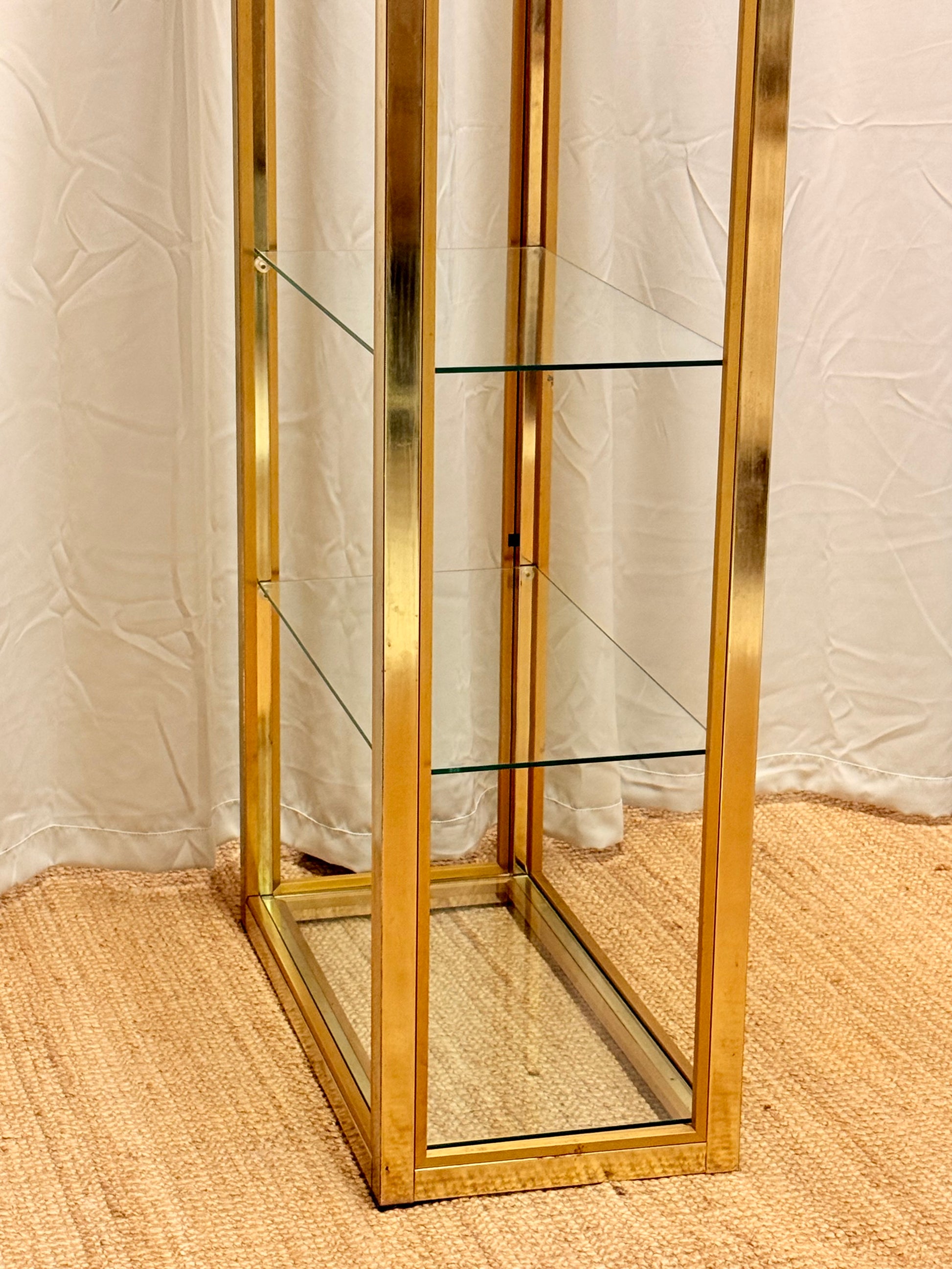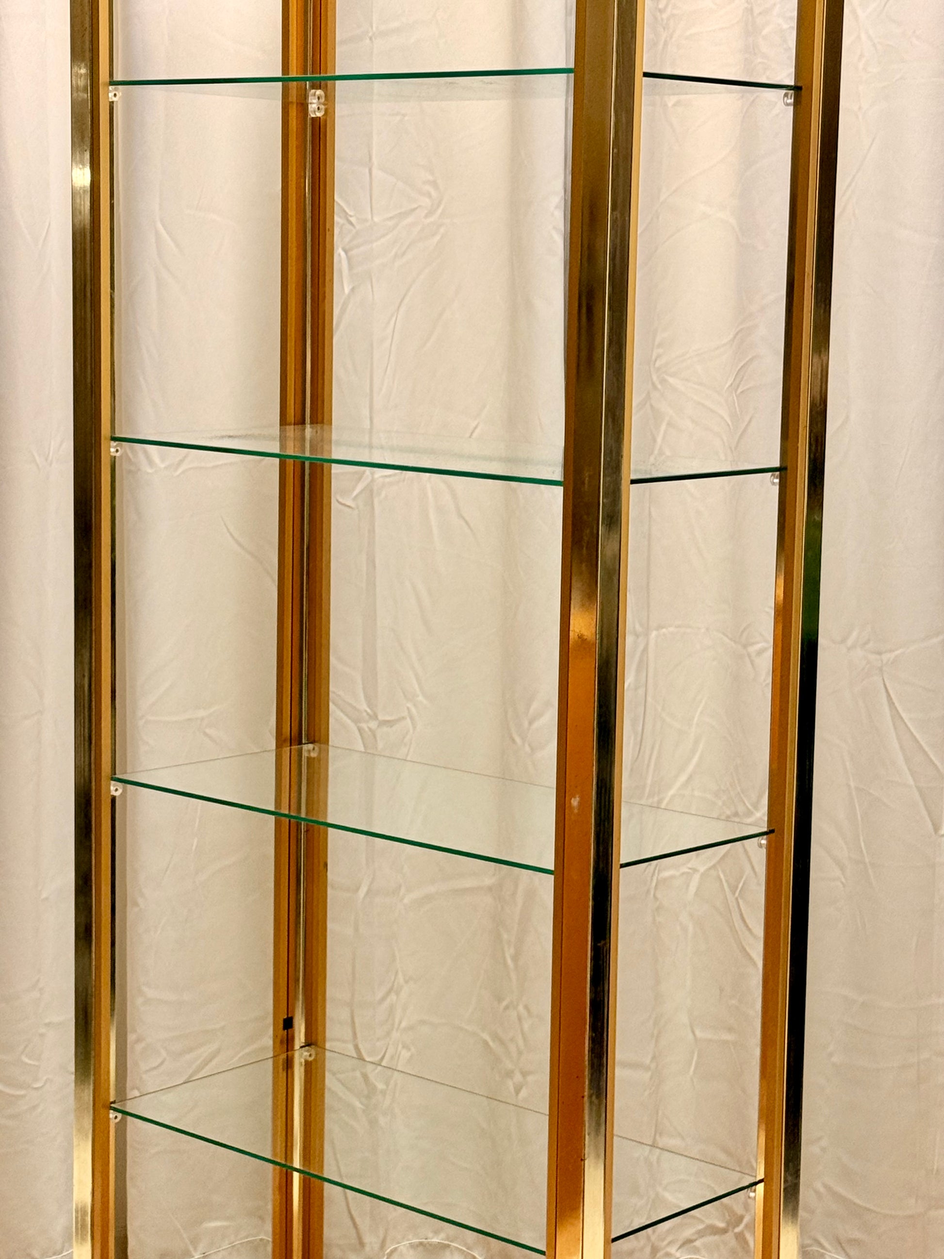 Large Italian Mid-Century Modern Gilt and Brass Etagere by Renato Zevi, a stunning piece crafted with glass, brass, and gilt-plated aluminum. Standing at 202 cm high, 76 cm wide, and 38 cm deep, this elegant etagere combines luxury and functionality. Perfect for showcasing decor, its sleek design reflects mid-century modern aesthetics. The gilt and brass finish adds a timeless sophistication, while the glass shelves provide a versatile display space. Ideal for vintage furniture enthusiasts, this piece is a statement addition to any living room or office.