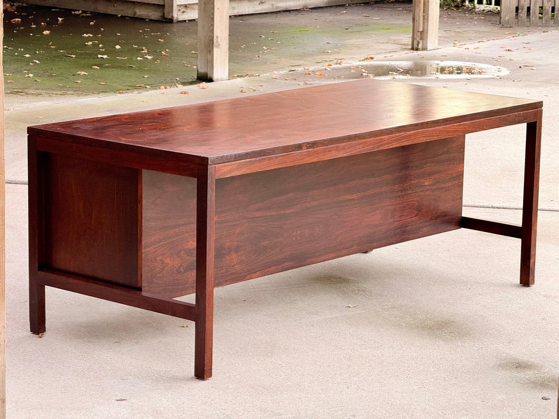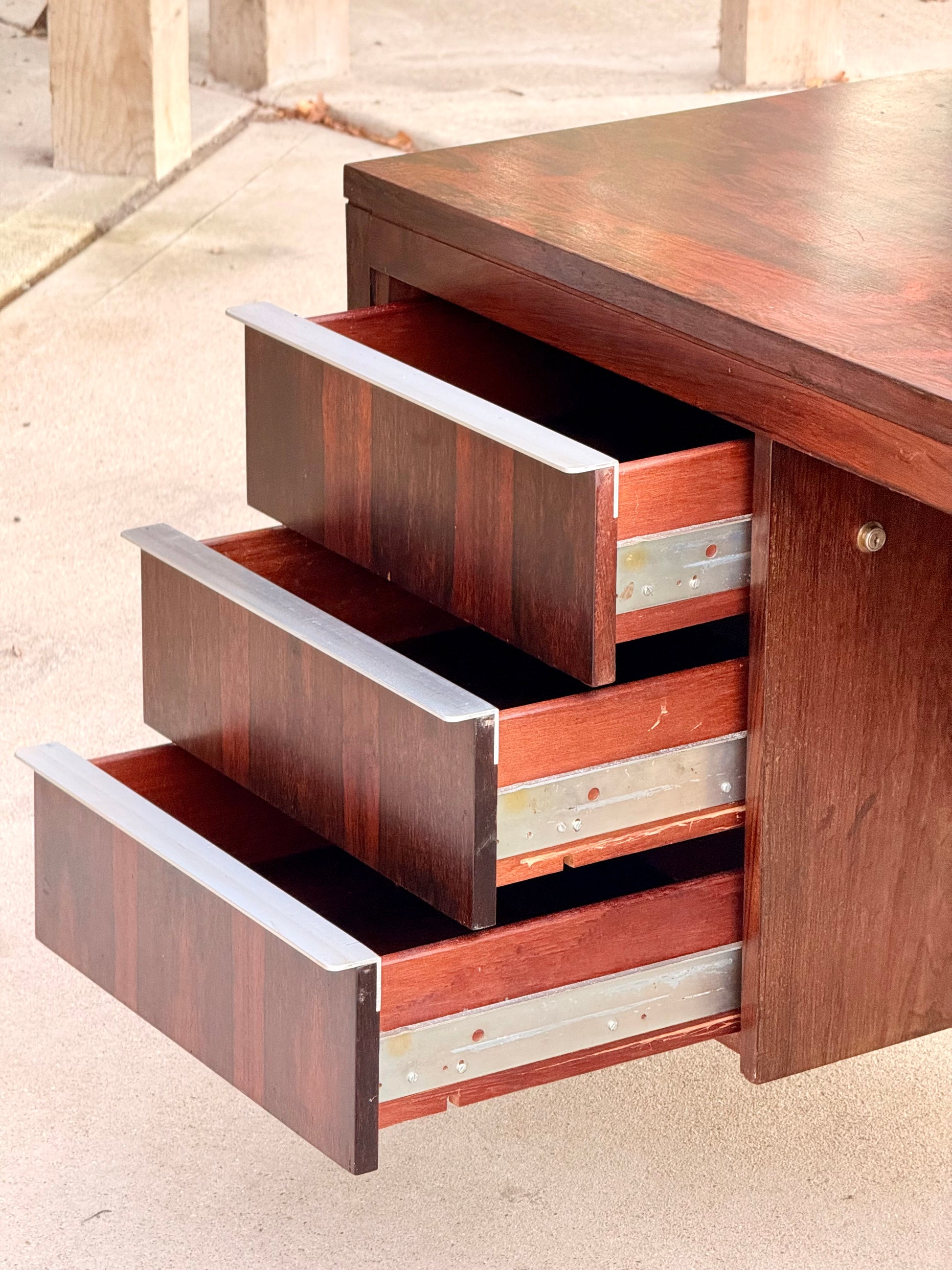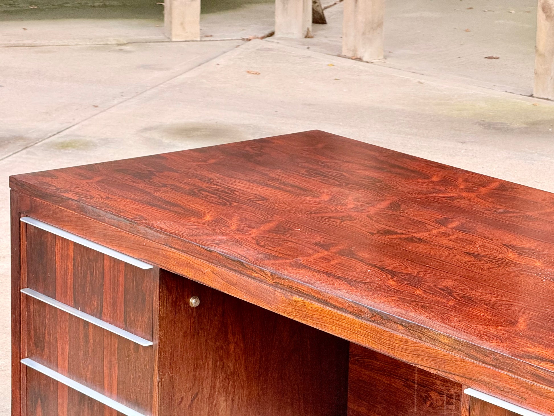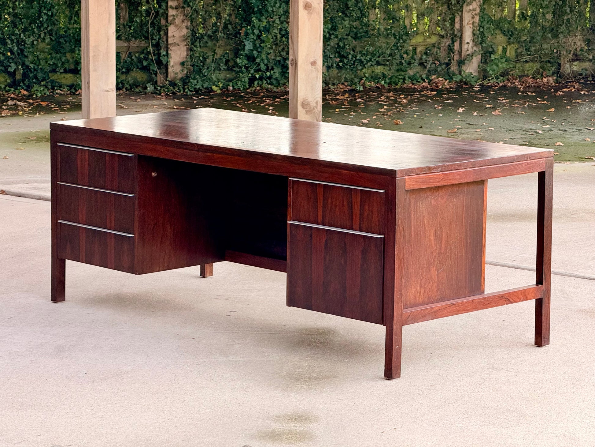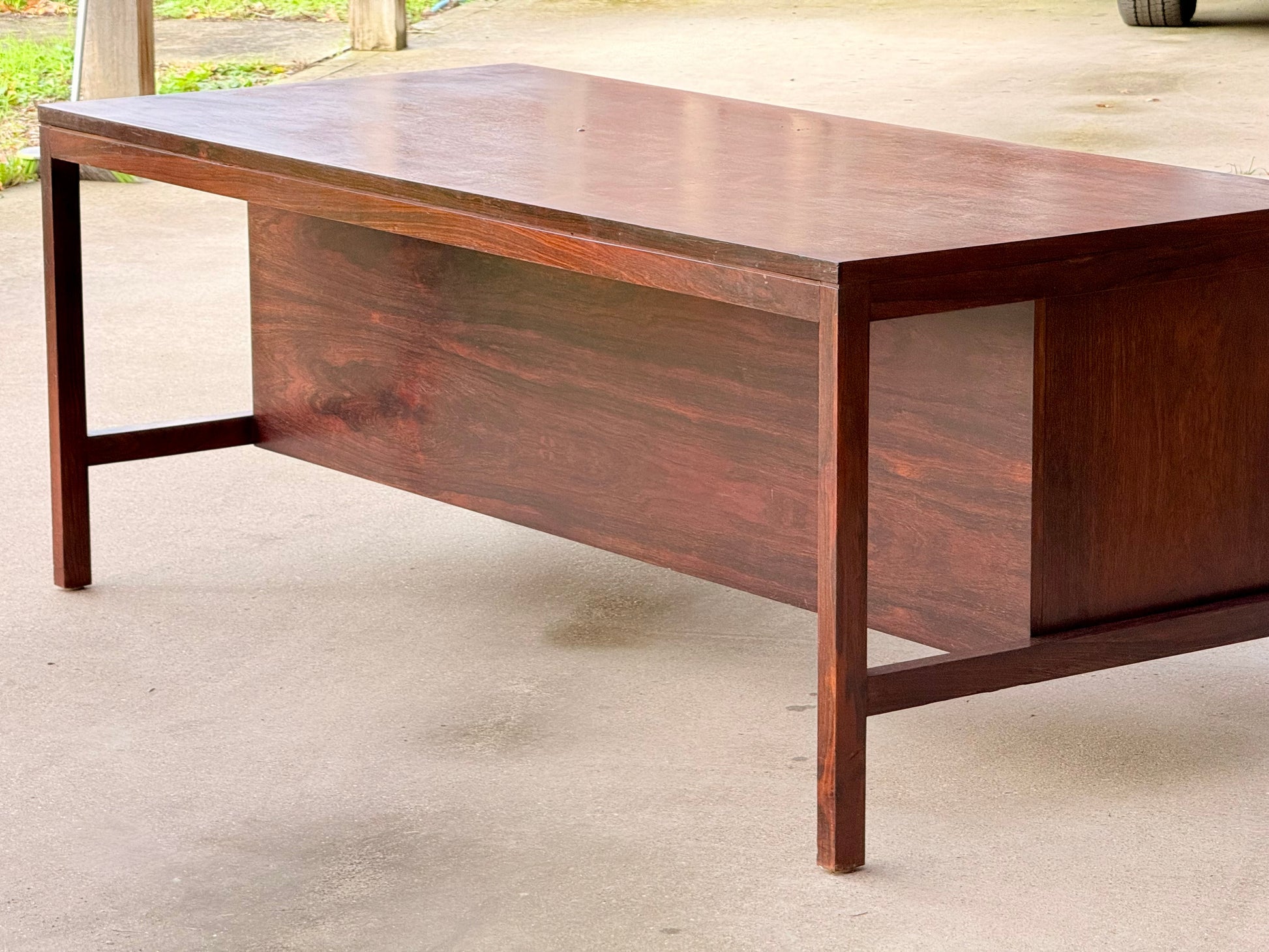 Authentic Large Danish mid-century modern executive desk, inspired by 1960s Scandinavian icons Finn Juhl and Arne Vodder. Premium exotic grain with deep finish; double pedestal design, left bank with 3 deep drawers and right bank with 2 drawers - one deeper for files/storage. Brushed steel/aluminium pulls ensure smooth operation. Durable vintage piece blends timeless elegance and superior organization for home office or professional use. GTIN: N/A | MPN: Custom Vintage | Condition: Used - Very Good - signs of use through light wear, scuffs and marks consistent with age.