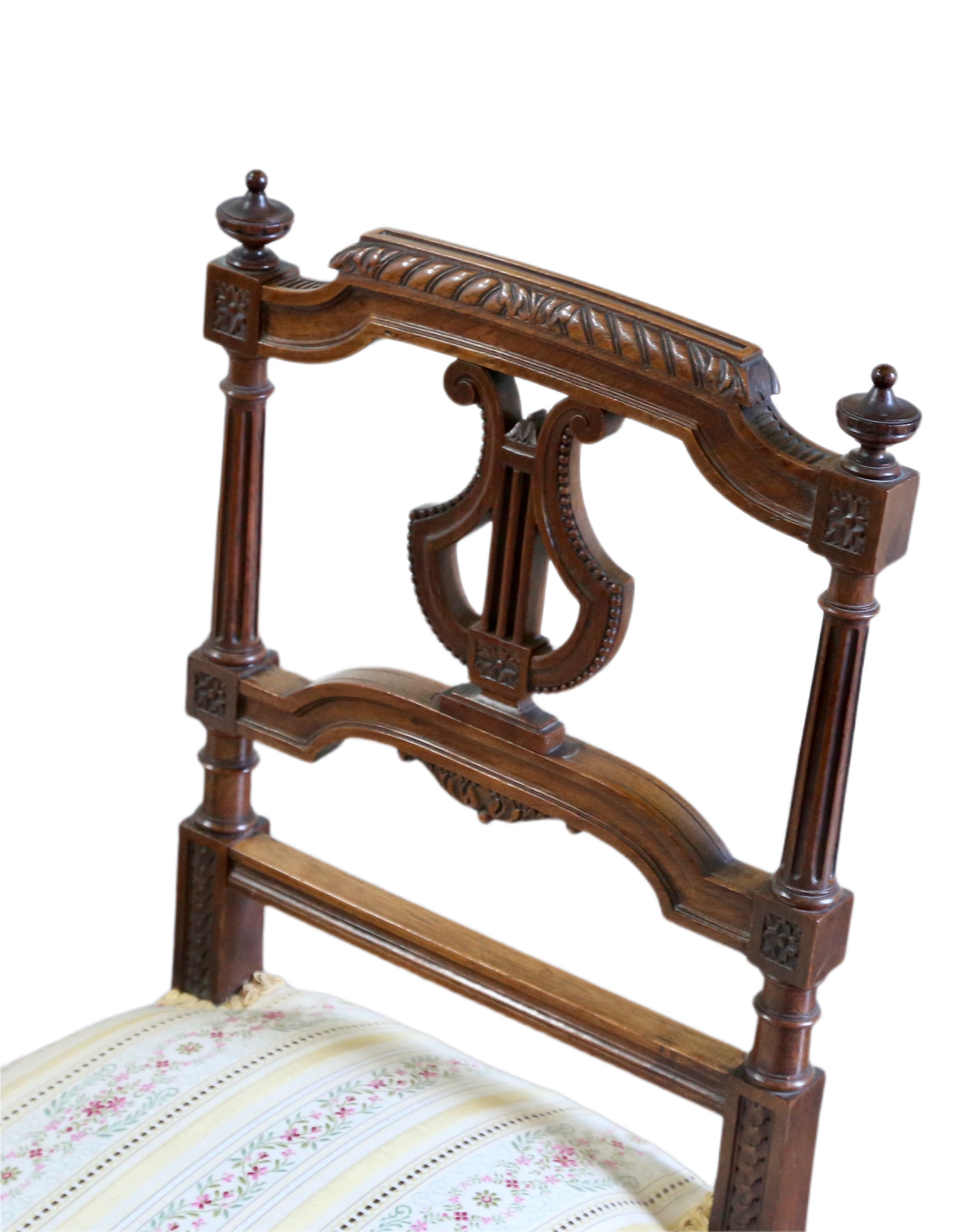 Ornate lyre-shaped backs topped with finials, reeded columns, with tapered and fluted legs.
